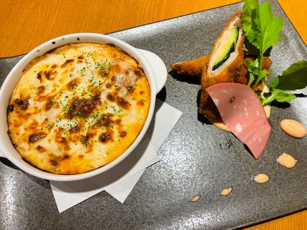 お肉の旨みが広がるラザニアと、豚肉でズッキーニを巻いた料理を、