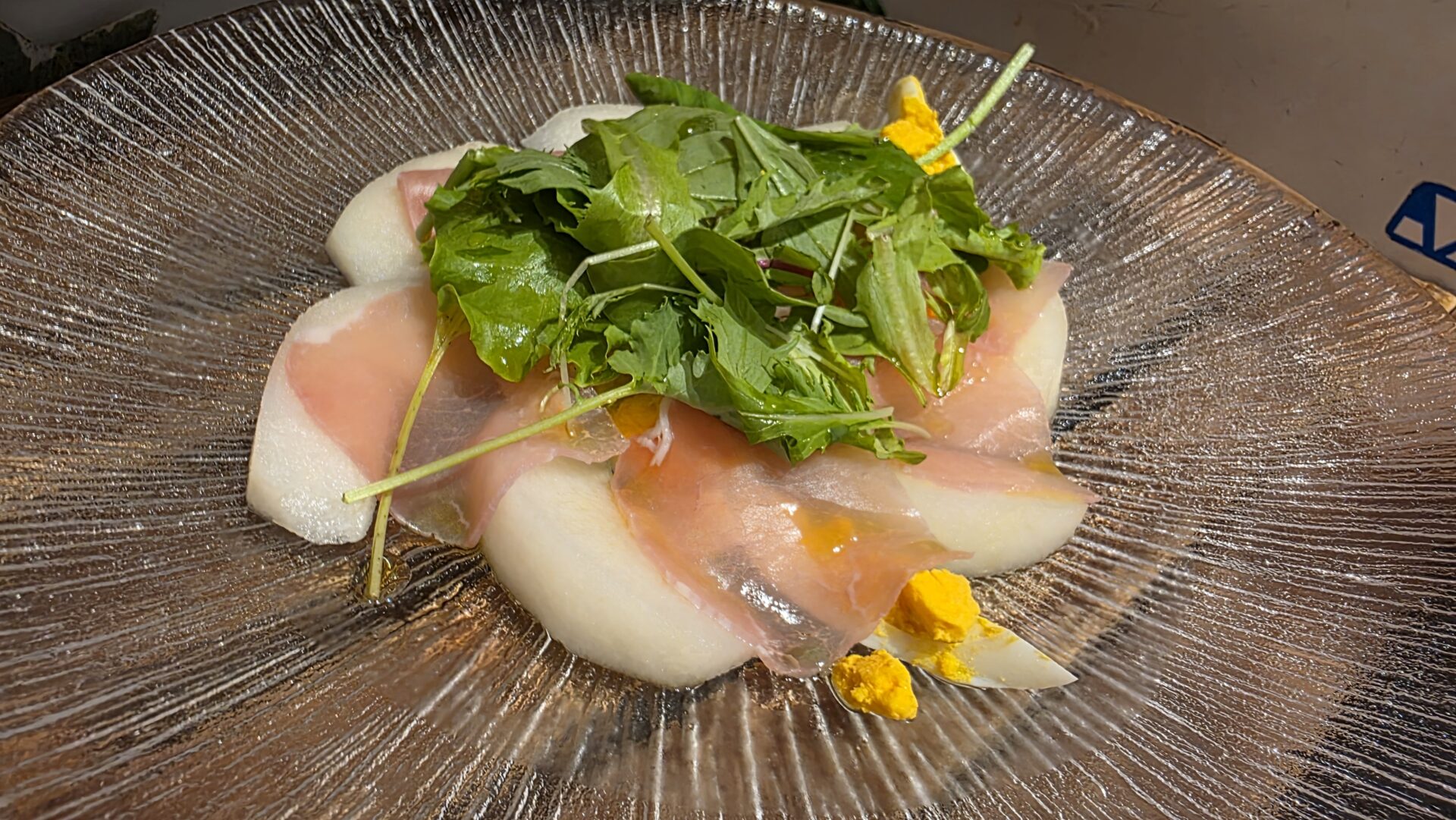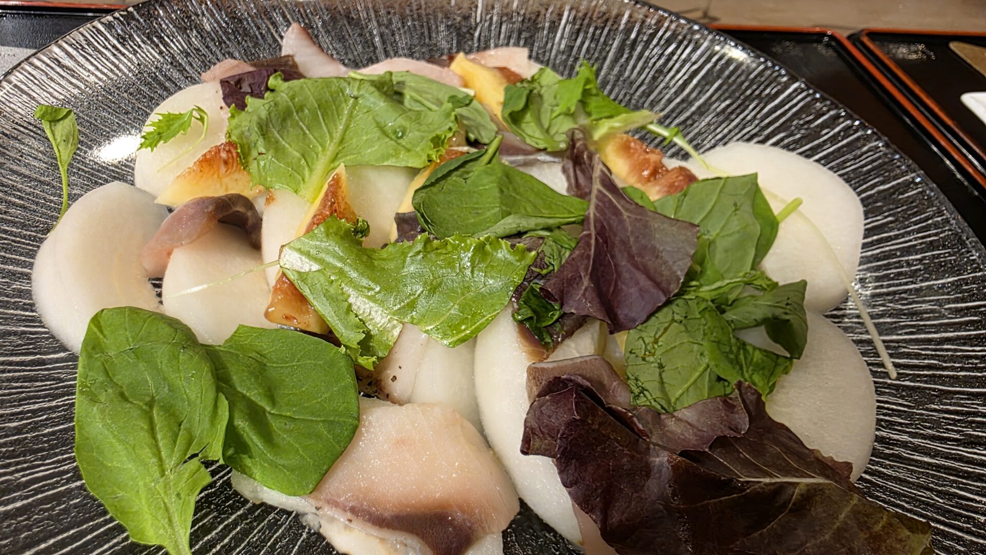 牛蒡サラダや薩摩芋と林檎のヨーグルト風味サラダ、生ハムと秋野菜の組み合わせなど、見た目にも美しい一皿を。分葱と蓮根の酢味噌和えや南関揚げの煮びたしなど、和の冷菜も豊富です。