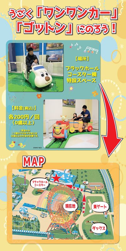 | 料金 | 500円(0歳から有料) ※回数券5枚でも可 ※お支払方法は「現金」「クレジットカード」「PayPay」がご利用いただけます ※フリーパスはご利用いただけません ※3歳以上は遊園地入園料が別途必要 |