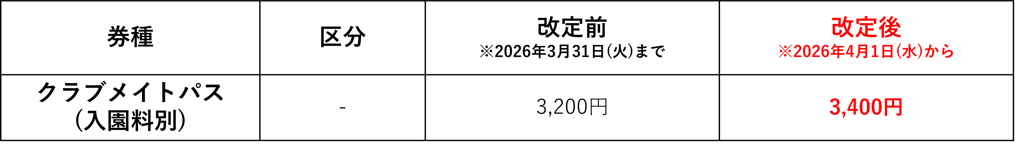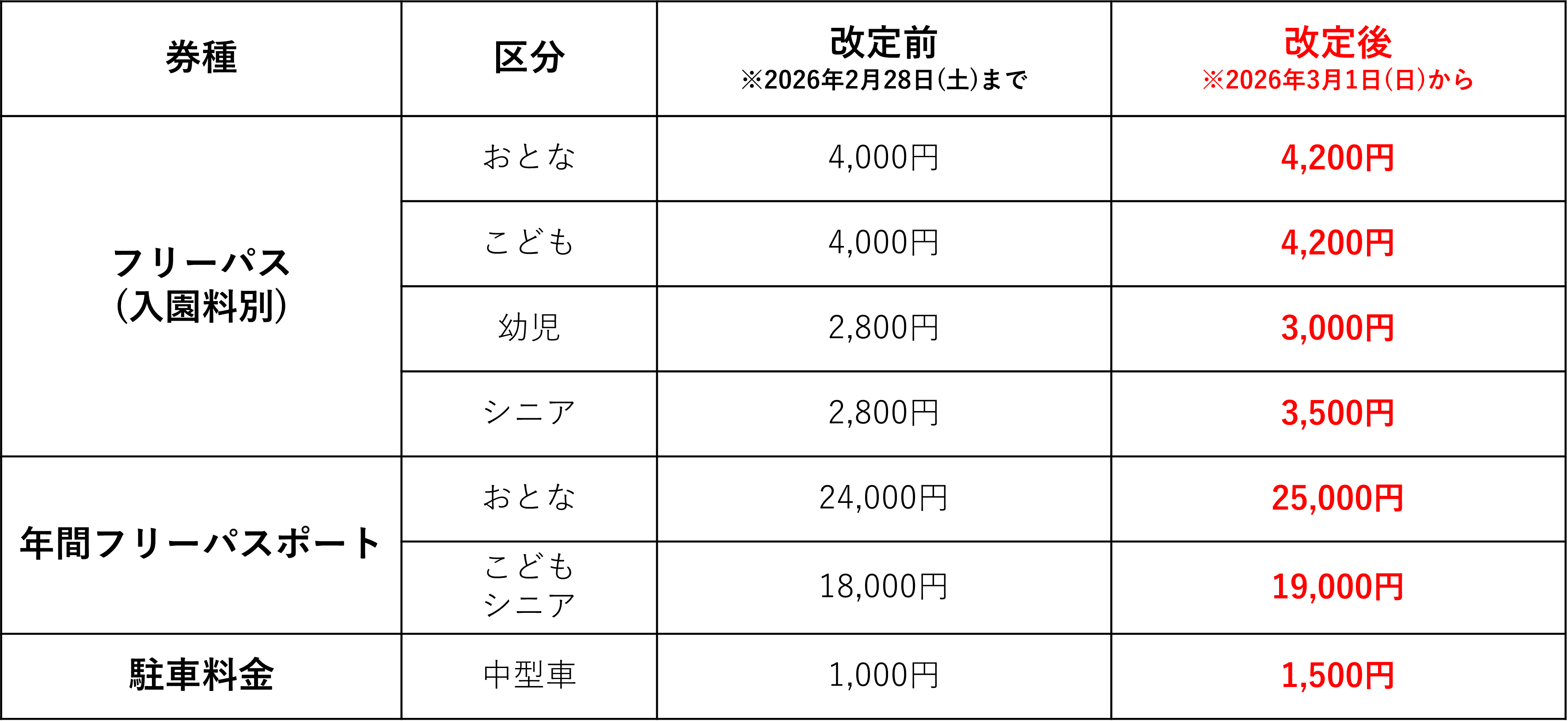 【2026年3月1日】料金改定のお知らせ シェア ツイート LINEで送る 2026/02/01 グリーンランド遊園地では2026年3月1日(日)以降、下記の通り一部の料金を改訂いたします。何卒ご理解のほどよろしくお願いいたします。 2026年3月1日(日)より ※料金は税込価格です 2026年4月1日(水)より ※料金は税込価格です