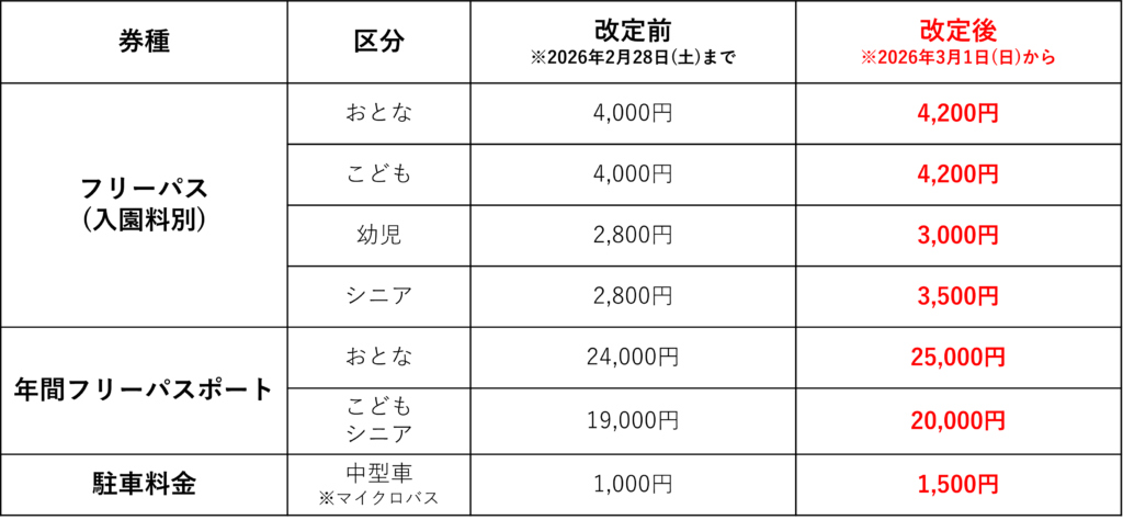 【2026年3月1日】料金改定のお知らせ シェア ツイート LINEで送る 2026/02/01 グリーンランド遊園地では2026年3月1日(日)以降、下記の通り一部の料金を改定いたします。何卒ご理解のほどよろしくお願いいたします。 2026年3月1日(日)より ※料金は税込価格です 2026年4月1日(水)より ※料金は税込価格です※詳細はクラブメイト団体ページをご確認ください。