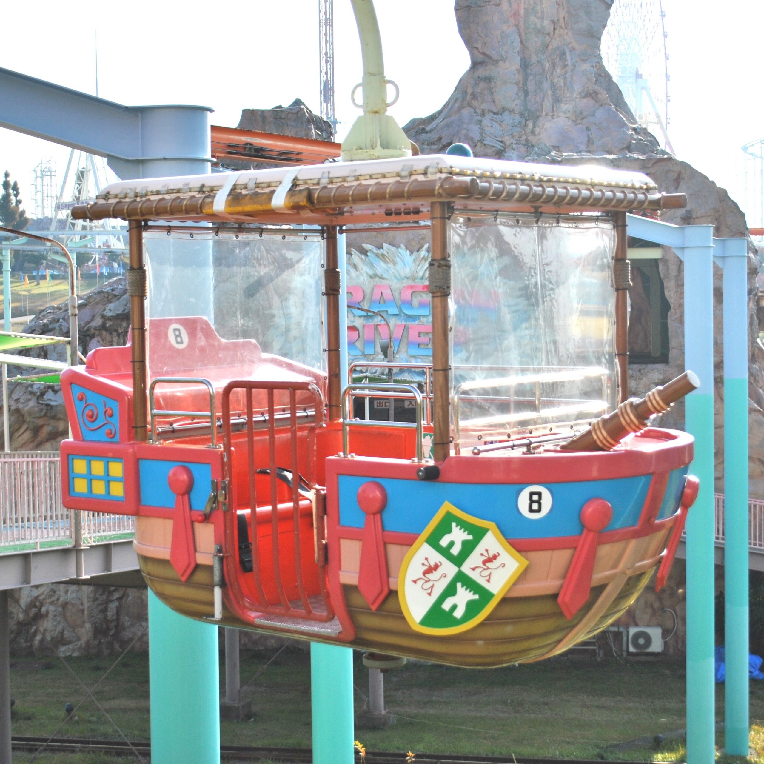 空飛ぶ「遊覧海賊船」は遊園地西側のエリア「ドラゴンバレー」と遊園地のほぼ中央をつなぐ、自走式モノレールです。