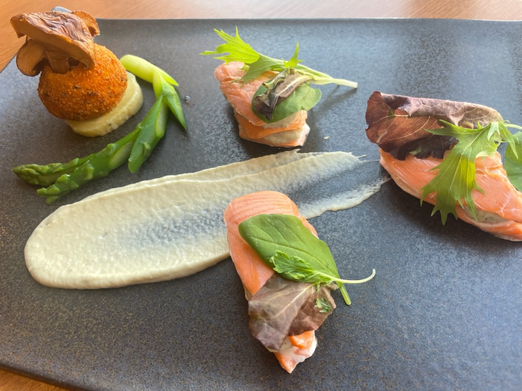 『秋鮭とホタテのムースのミルフィーユ アランチーニ添え 茄子のピューレと共に』です。