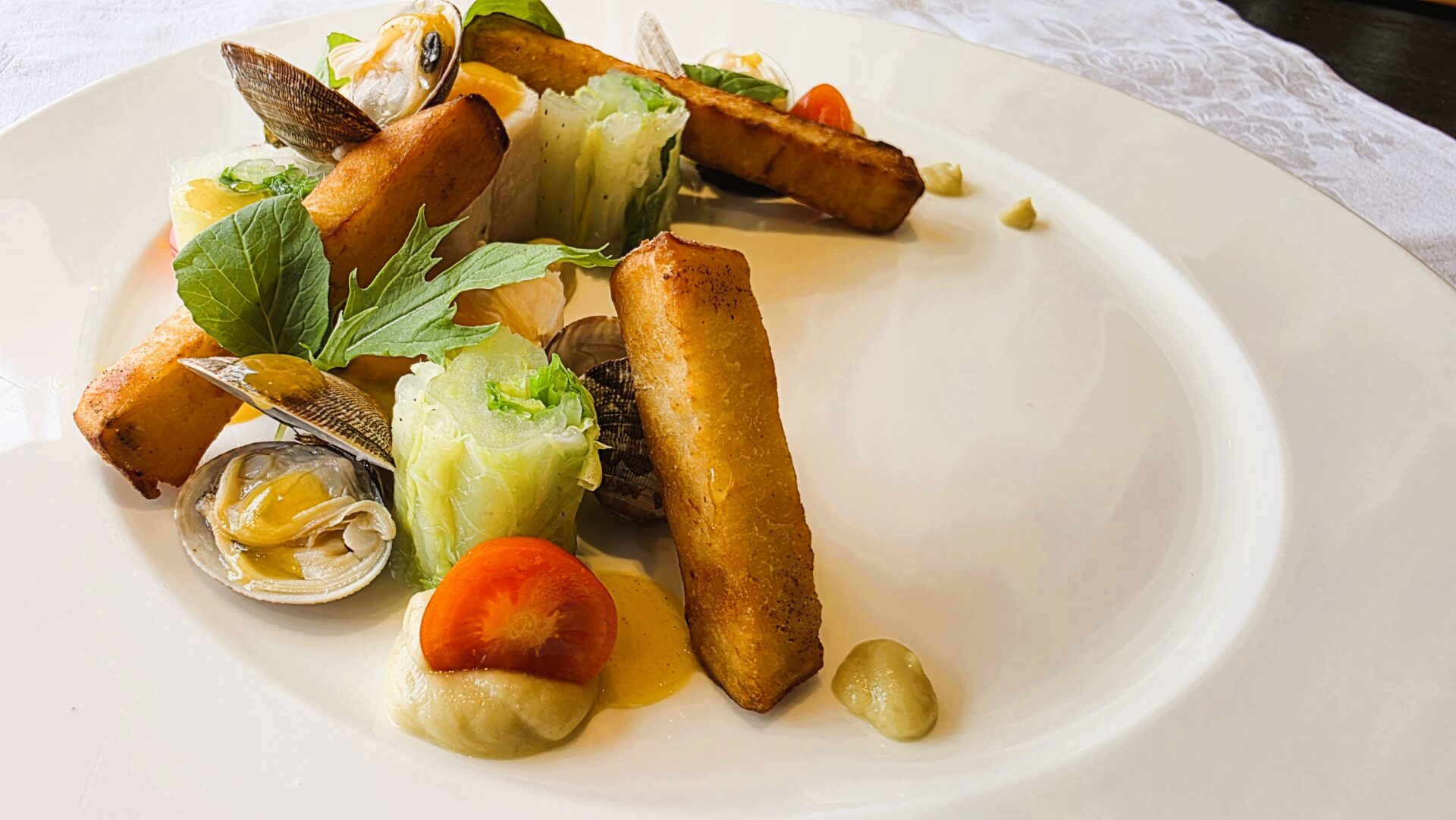 白身魚で具材を包んだロール仕立ての一品に、アサリの旨味を活かしたソースと秋茄子のピューレを添えました。