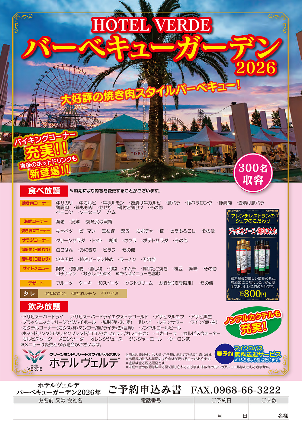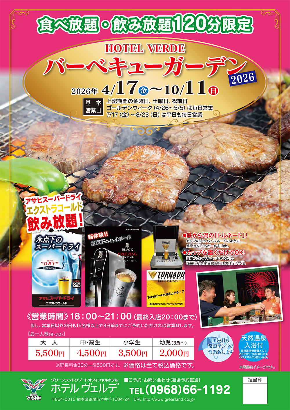 RESTAURANT レストラン ホテル ヴェルデ【HOME】 > レストラン > バーベキューガーデン BBQ GAERDEN 大好評の焼き肉スタイルバーベキュー アサヒスーパードライ エクストラコールド飲み放題!!バイキングコーナー充実!!食後のホットドリンクも登場!! INFORMATION インフォメーション 基本情報 営業期間 2026年4月17日(金)~10月11日(日)※期間中の金曜日、土曜日、祝前日※ゴールデンウィーク(4/26~5/5)は毎日営業※7/17(金)〜8/23(日)は平日も毎日営業 営業時間 《夜の部》18:00〜21:00(最終入店20:00まで)※但し、営業日以外の日も15名様以上で3日前までにご予約いただければ営業致します。 料金 《大 人》 5,500円 《中・高年》 4,500円 《小学生》 3,500円 《幼児(3歳〜)》 2,000円 ※延長料金30分一律500円です。※価格は全て税込価格です。 ご予約・お問合せ 0968-66-1192 バーベキューガーデンのご案内 PDFのダウンロードはこちら RESTAURANT レストラン一覧 レストラン フォンターナ 朝食/ランチ/ディナー 日本料理「小岱」 ランチ/ディナー バーベキューガーデン BBQ
