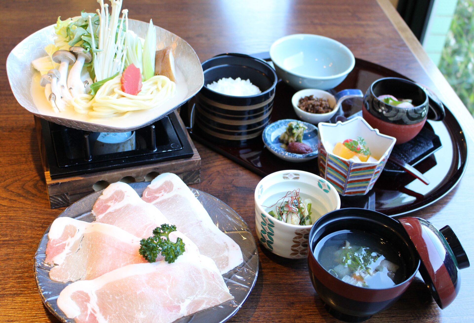 すき焼き、りんどうポークしゃぶしゃぶ、寄せ鍋、の3種類があります。