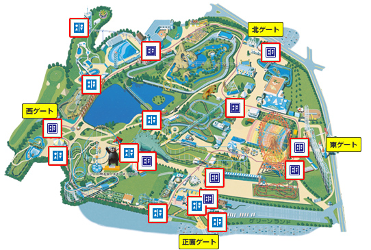 遊園地内に、17箇所のトイレを設置いたしております。そのうち9箇所が多目的トイレを併設いたしております。(ベビーベッドは一部の多目的トイレ内に設置しております。)
