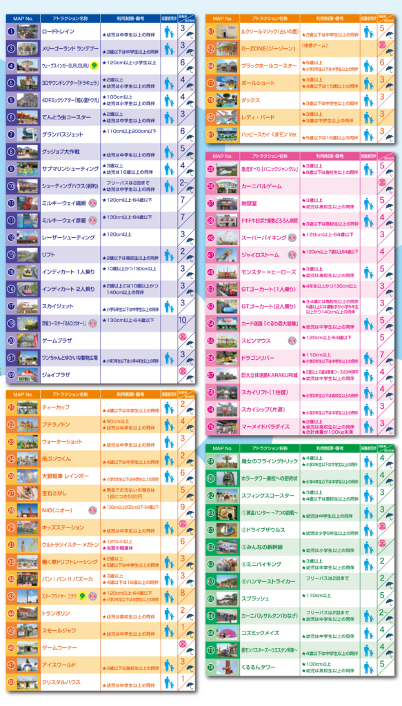 園内マップのアトラクション一覧に傘マークがついたものは雨に強いアトラクションになっています。