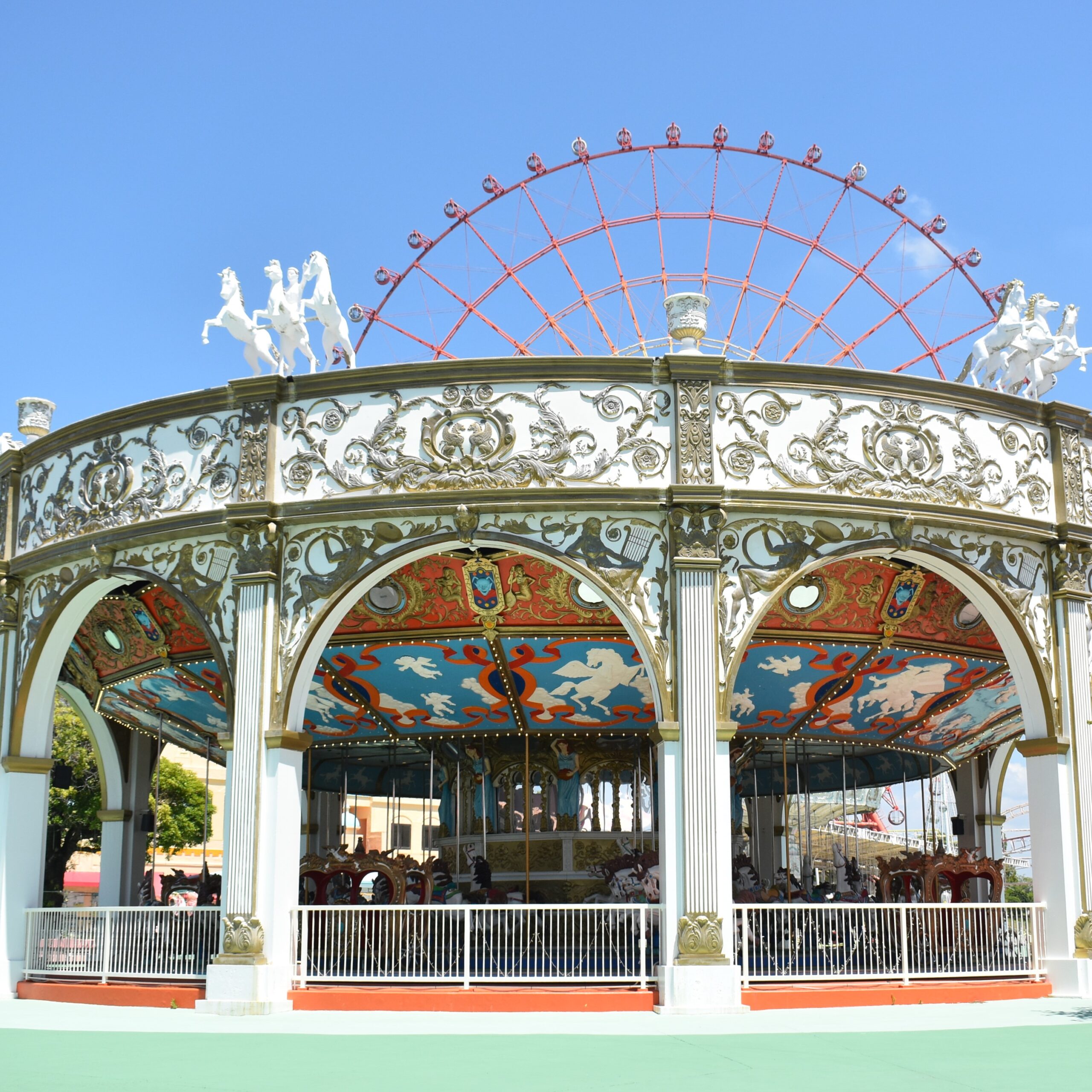 1層式では、日本最大級となる直径28mの巨大メリーゴーランド。カップルでのるもよし、家族で馬車にのるもよし。また、夜間営業の時は、イルミネーションに注目!天井の光が反射して、幻想の世界に。
