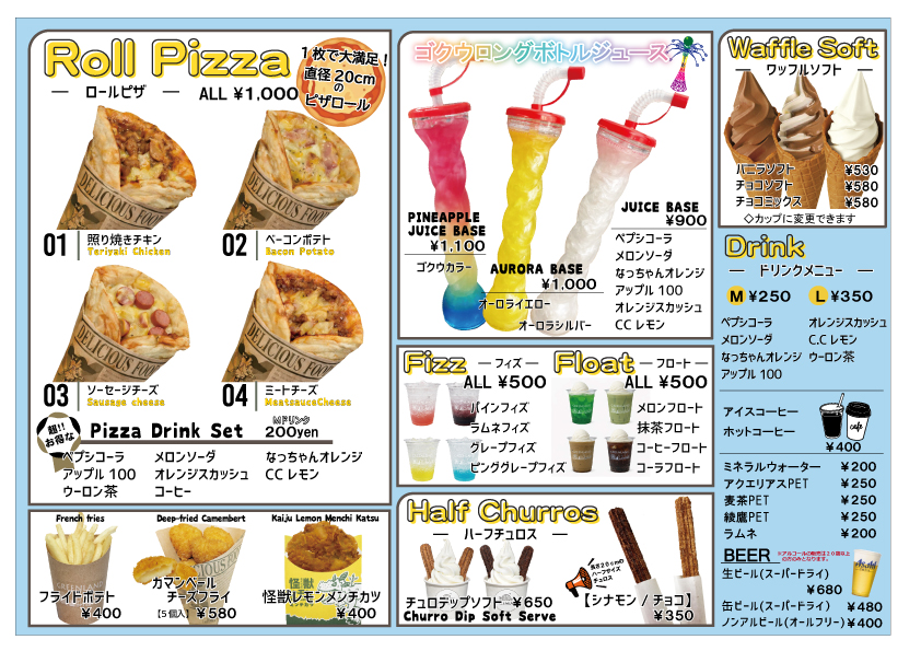 | おもなメニュー | ロールピザ(全4種):1000円 ゴクウロングボトルジュース:1000円~1100円 怪獣レモンメンチカツ:400円 ハーフチュロス(チョコ・シナモン):350円 ポテト:400円 |